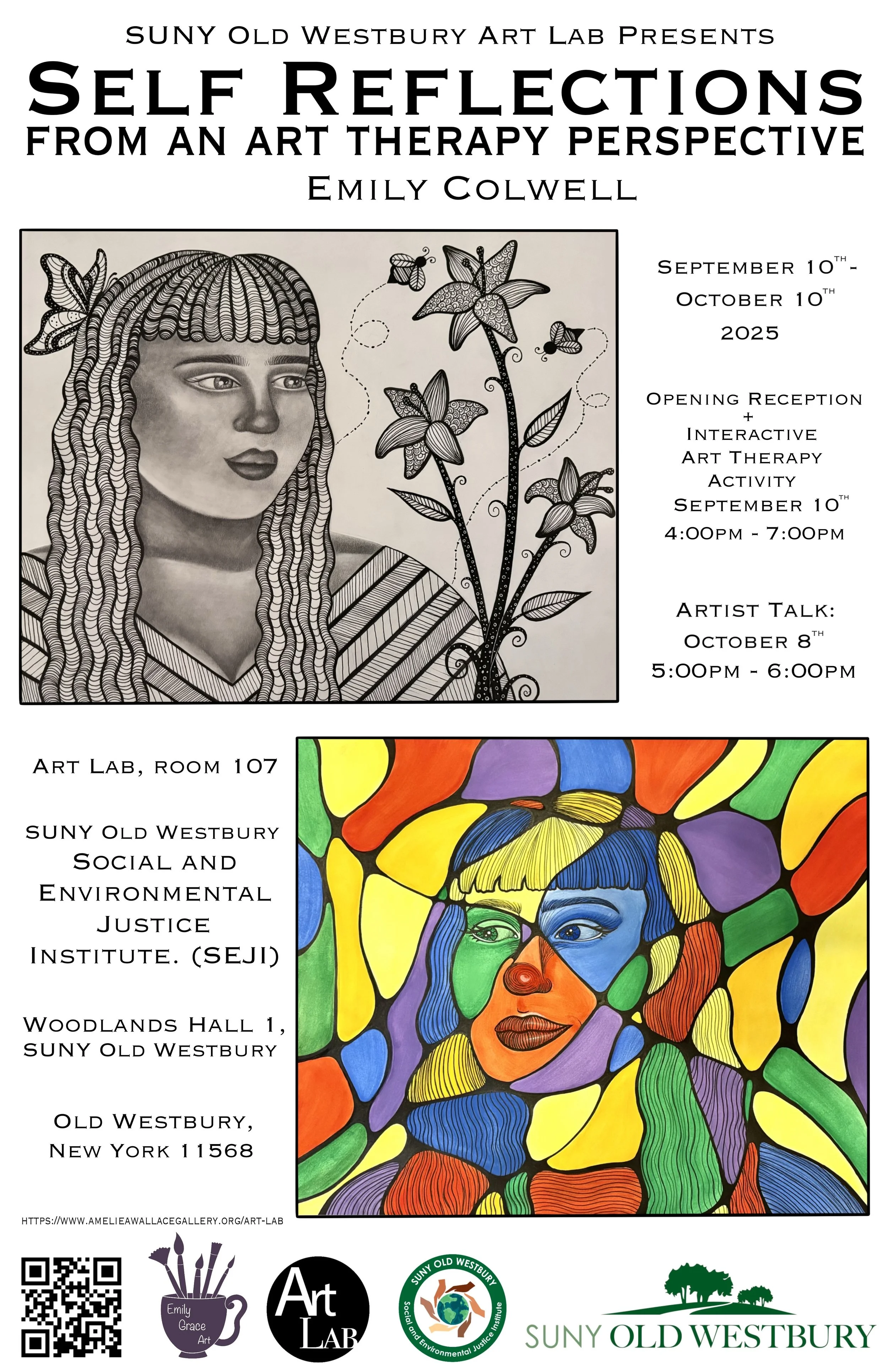 ART LAB of the Social and Environmental Justice Institute (SEJI) at SUNY Old Westbury is pleased to announce Self-Reflections from an Art Therapy Perspective, a solo exhibition by Emily Colwell (b. 1999, Hicksville, NY), an alumna of the Visual Arts Department at SUNY Old Westbury and a graduate student at Hofstra University pursuing her Master’s degree in Creative Arts Therapy. The exhibition reflects Colwell’s personal and professional journey through the lens of art therapy. In this body of work, she incorporates multiple methods used in art therapy for their grounding, expressive, and intuitive qualities, exploring her evolving identity as an art therapist.
